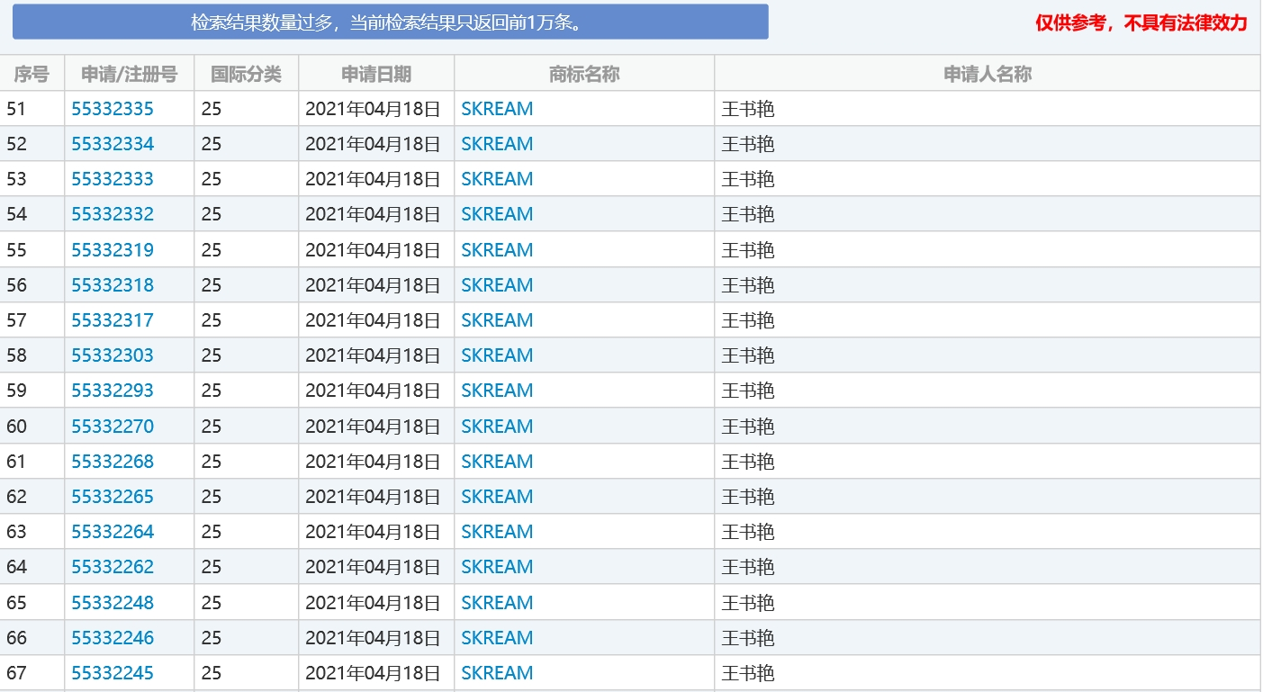 商标界奇女子2021年全球第一大商标申请人是中国湖南省的王书艳,今年在中国提交了30,343件商标申请,全部在第 25 类(服装),全部在 28 天内,而这一切都是为了商标“SKREAM”。