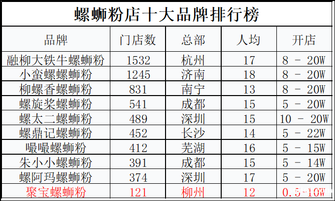 聚宝螺蛳粉:柳州品牌,121家门店,人均12.34元,开店费用0.5-10万。